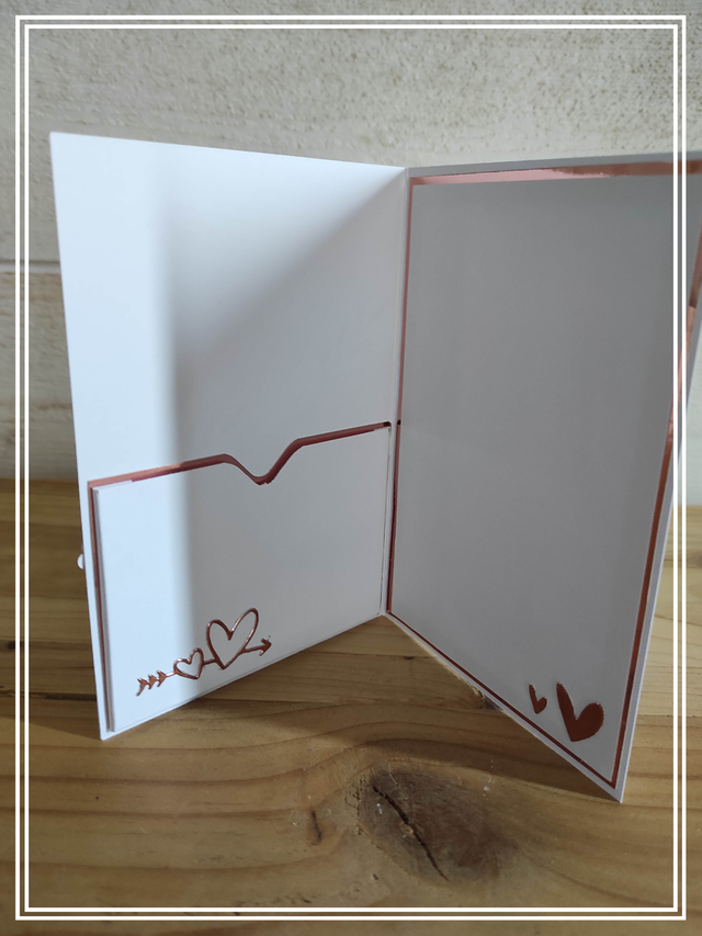 Enveloppe assortie décorée d'un motif cœur et flèche rose gold.
